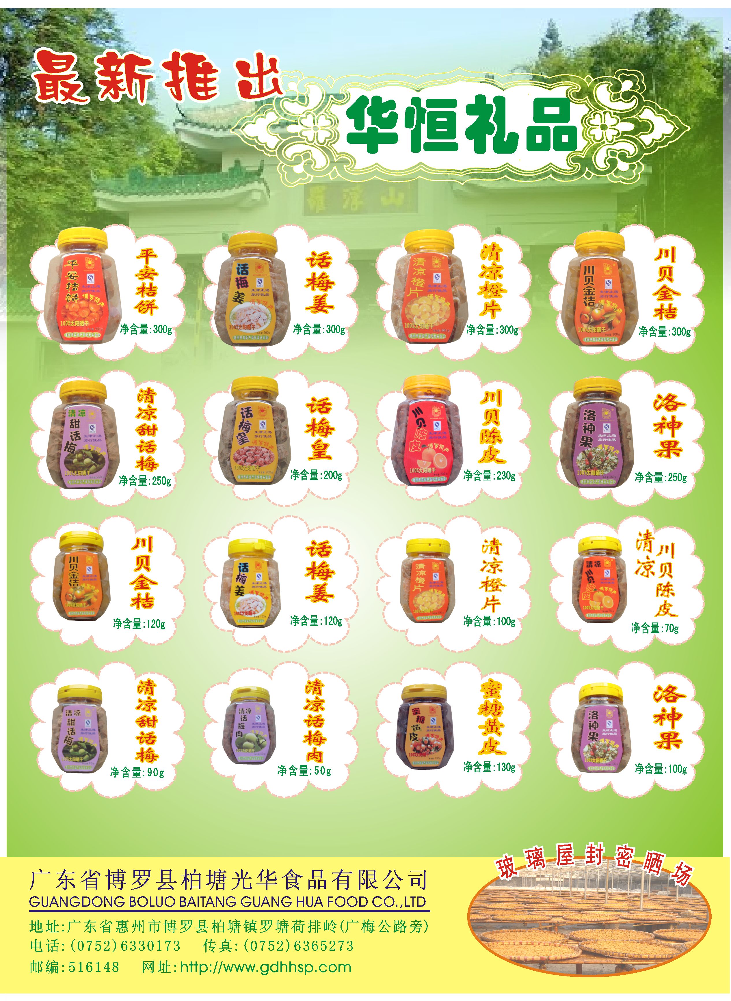 广东省博罗县柏塘光华食品有限公司 地址:广东省惠州市博罗县柏塘镇罗塘荷排岭 电话:0752-6330173 传真:0752-6365273 邮箱:guanghua6330173@126.com 邮编:516148
